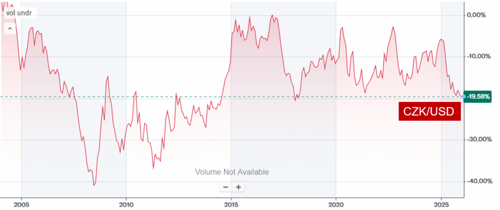V takových situacích je dobré vidět věci v širším kontextu. Za poslední dvě dekády udělal měnový pár USD/CZK hodně pohybů, mnoho z nich bylo i významnějších než to, co se stalo tento rok. Jasně, je to už významný posun, ale ne absolutně nevídaný. I kdyby šlo o permanentní oslabení dolaru vůči ostatním měnám, nejde (zatím) o extrémní drama, které by mělo šanci vymazat mnohaleté zisky.