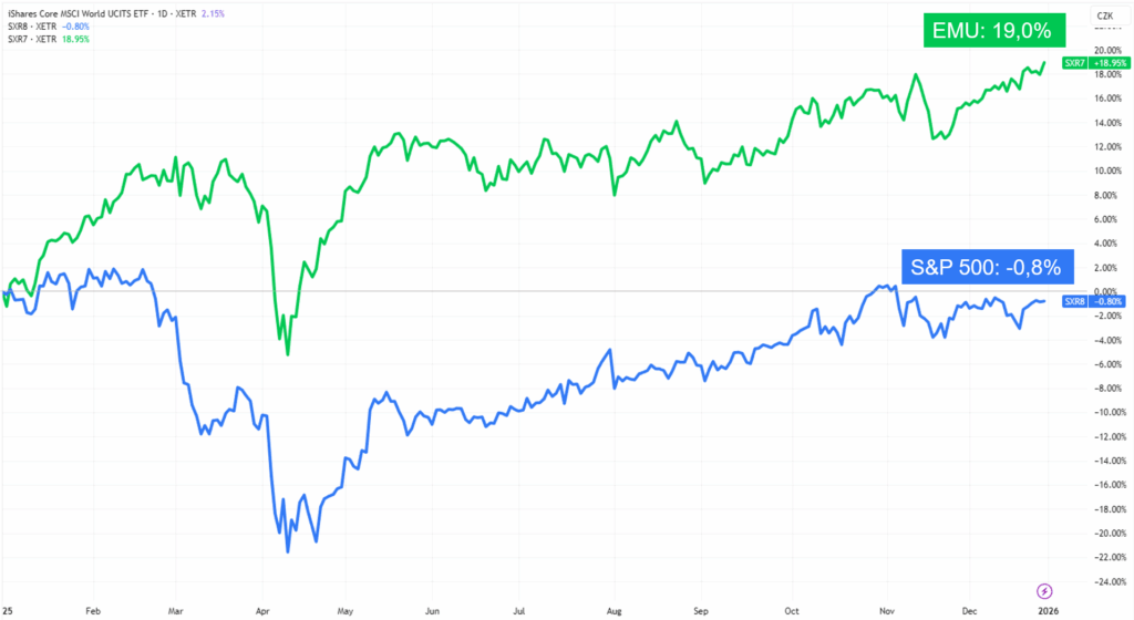 Protože další z investičně „zlých“ věcí, které s tím souvisí, je obecný Trump effect a jeho destabilizace globálního pořádku a klasického transatlantického předporozumění a souzvuku. Nejistoty nemají dlouhodobé investice rády, protože se mění zavedené pořádky a špatně se extrapoluje. Dobrou ukázkou tohoto efektu je snížení důvěry v americký investiční prostor a částečná rotace kapitálu k jiným oblastem, což hezky ukazuje výnos ETF evropský hospodářský prostor (EMU: 19% výnos v CZK) oproti ETF na S&P 500 (záporná nula v CZK), MSCI World by byl těsně nad Amerikou.