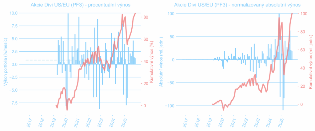 Vyjádřeno v CZK naše portfolio za rok 2025 zvýšilo hodnotu o 8,4% při zohlednění velikosti vkladů, podkladová aktiva narostla o 8,6%. To je o dost víc, než kolik vynesl americký S&P 500 (cca –1%). Vliv na to měla hlavně akciová diverzifikace do Evropy (+19%) a ČR (+52%), dluhopisům ČR samotným se moc nedařilo (+2%) – v nich máme ovšem uzamčený čistý výnos 4,5% ročně (~5,3% hrubý výnos) po dobu cca 12 let.