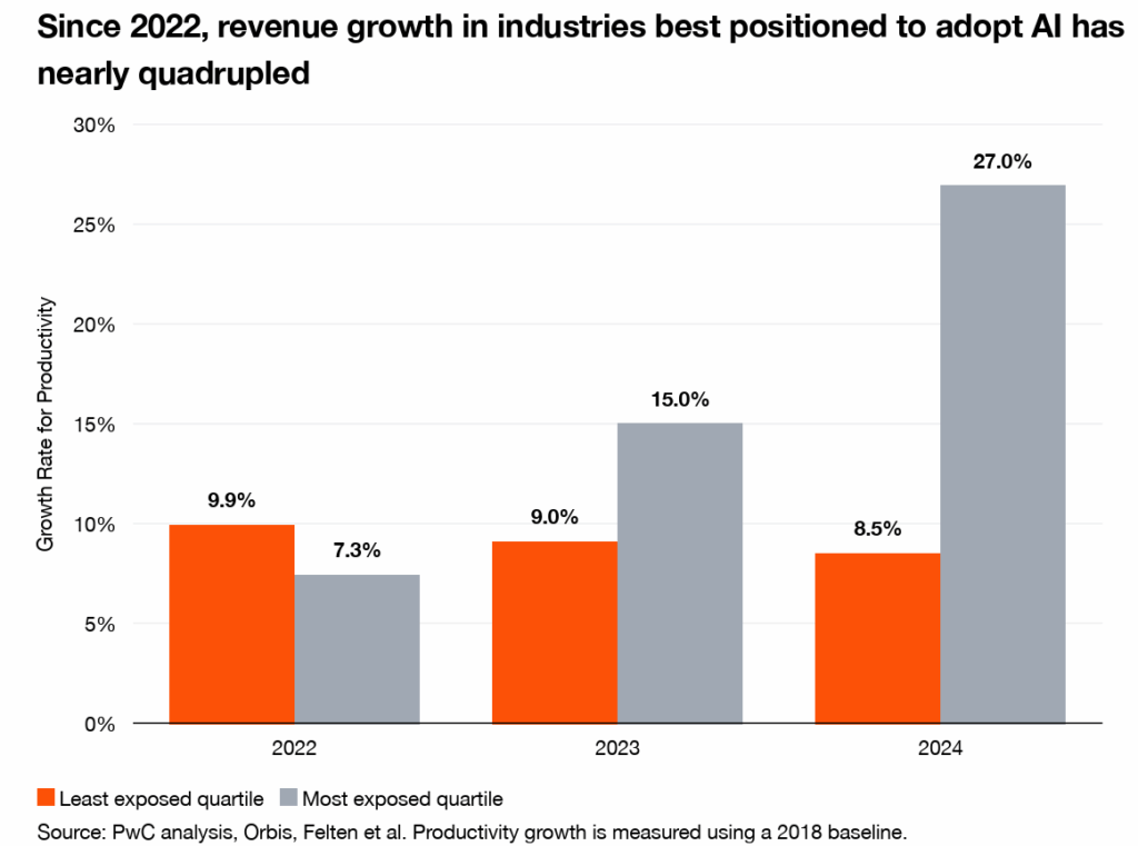 V roce 2025 vyšlo několik vážných studií o dopadu AI na ziskovost firem a produktivitu práce. Velmi zajímavá pro mě byla analýza PwC o vlivu AI na pracovní trh. Ta tvrdí, že růst produktivity, měřené jako růst tržeb na zaměstnance, se dramaticky zvýšil u firem, které využívají AI technologie nejvíce (Q1) a dosahuje trojnásobného růstu oproti těm, které ji využívají nejméně (Q4).