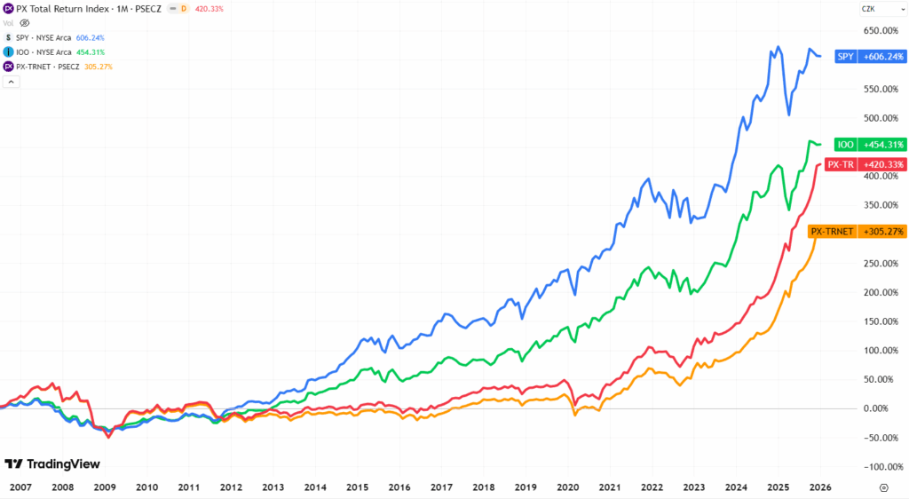 Od chvíle těsně před vypuknutím COVIDového propadu v únoru 2020 do současnosti, tedy za necelých 6 let, vynesla Čechovi investice do amerického trhu v české koruně a po zohlednění české inflace (!) 40% (5,9% ročně), do světového indexu 29% (4,5% ročně) a do Evropy 18% (2,9% ročně).
